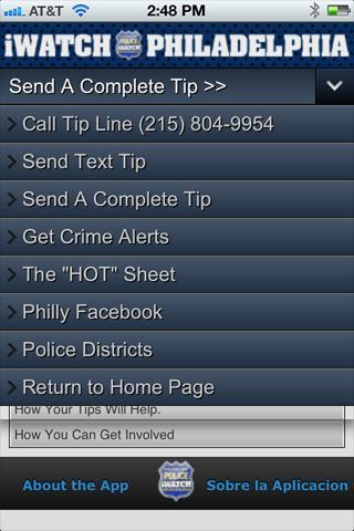 스마트 폰에서 iWatch Philadelphia 앱 아이콘을 클릭하면 (무료로 다운로드 할 수 있음) 시민 또는 방문객은 팁을 제출할 수 있습니다. 모바일 앱을 통해 개인은 자신이 본 범죄에 대해보고하거나 발생하는 동안보고 할 수 있습니다. 이 시스템을 통해 사용자는 범죄자 사진 및 범죄 활동을 포함하여 법 집행 기관의 검토를 위해 문자 메시지, 정적 이미지 또는 비디오를 업로드 할 수 있으므로 법 집행 기관이 팁 스터로부터 훨씬 더 자세한 내용을 가질 수 있습니다.